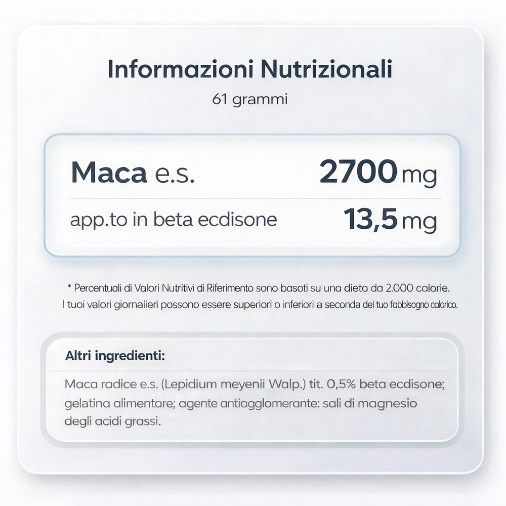 • Maca radice estratto secco (Lepidium meyenii Walp.) – titolata allo 0,5 % in beta-ecdisone e standardizzata per massima attività;